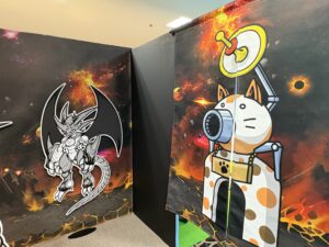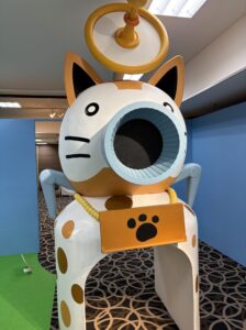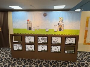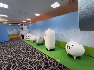 息子はこのお面を手にした瞬間、満面の笑みを浮かべ、すぐさま頭に装着。被るだけで気分はすっかりにゃんこ軍団の一員です。お面をつけた小さな司令官の先導で、いよいよ展示エリアへ。入り口には巨大なフォトスポットがあり、お馴染みのキャラクターたちが「侵略開始」を告げるかのように出迎えてくれました。