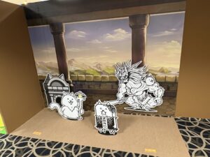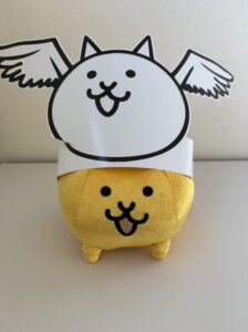 ゲームでお馴染みの「自分の拠点(塔)」が立体的なオブジェとして出現。息子はお面をつけたまま、塔から「シュタッ!」と出撃するポーズを決め、なりきり遊びに夢中です。さらに、横にはタンクネコの等身大人形が。息子の身長とほぼ同じサイズのタンクネコ。いつもスマホの画面で豆粒のように動いているにゃんこが、自分と同じサイズでそこにいる。このリアリティこそが、展示会の最大の醍醐味だと感じました。